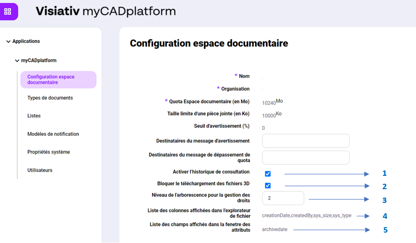 Ermöglicht die Konfiguration der wichtigsten Einstellungen des Dokumentationsbereichs myCADplatform.