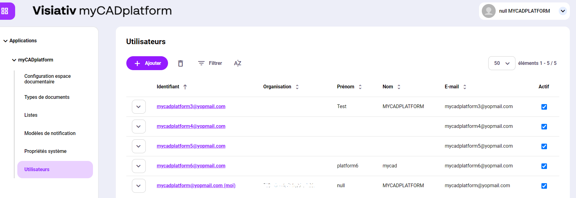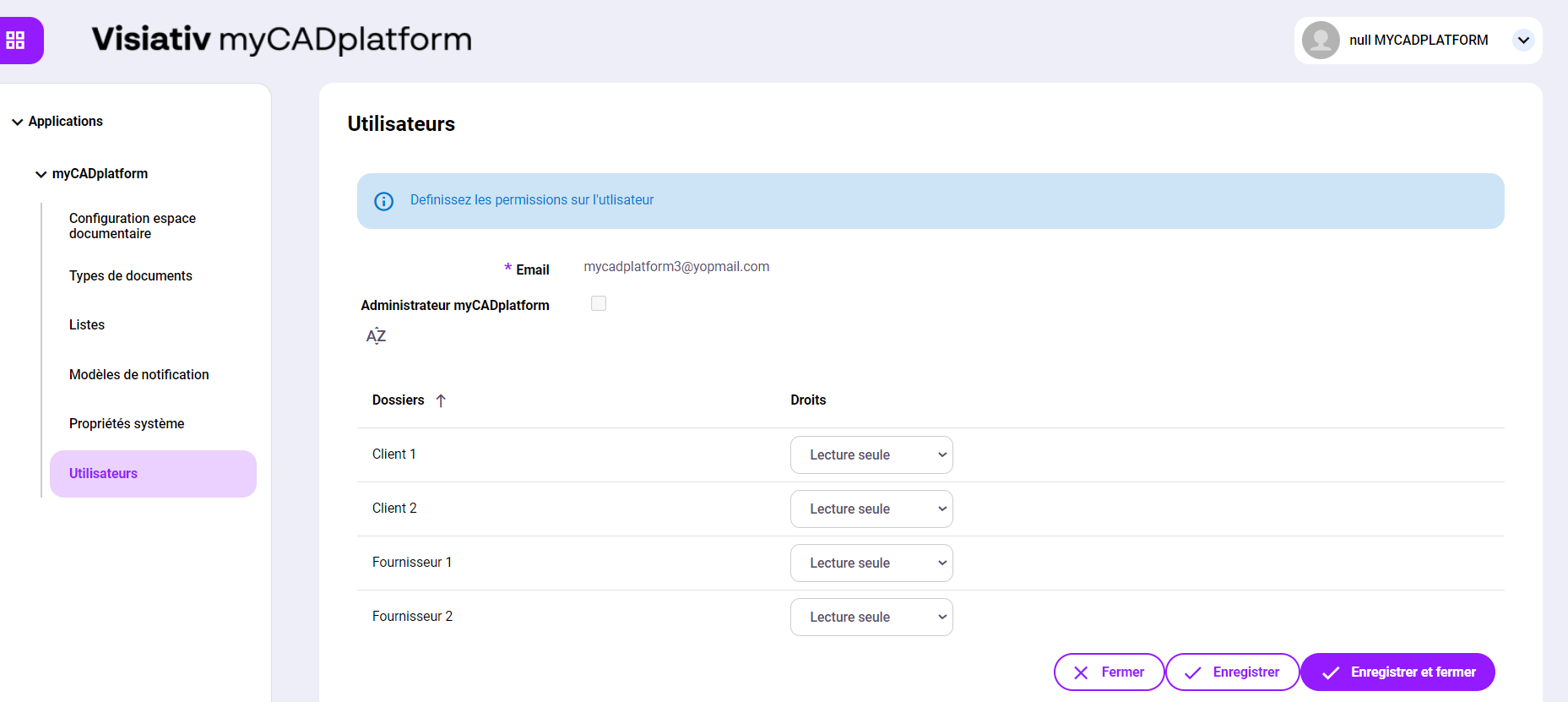 Access rights can be created or modified from the Middle Office. This is where you'll find the list of users with accounts in your myCADplatform space. For each of these accounts, you can modify the rights (read-only or read and write or none) or delete the account.