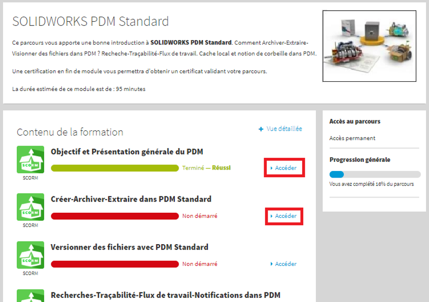 Quand vous accédez au contenu d’une formation, vous retrouvez la même vue que précédemment ( « Découvrir »)