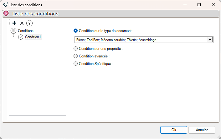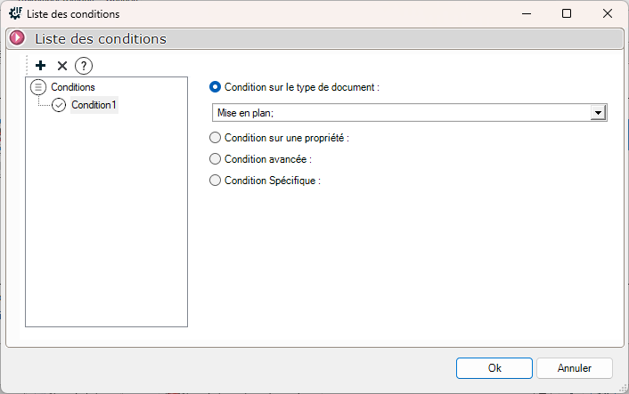 Es werden mehrere Auswahlmöglichkeiten angeboten. Für unser Beispiel werden wir zunächst eine Bedingung für den Dokumententyp "" hinzufügenPlanen". In einem zweiten Schritt fügen wir eine Bedingung hinzu, um "UND" zu machen, auf die Eigenschaft "".Kommentare" gleich "PDF"