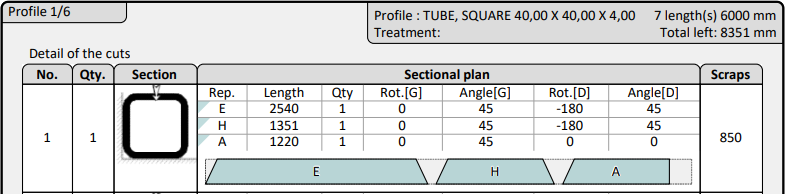 Übersicht der Schnitte über die zuvor definierte Stablänge mit einer Berechnung des Endfalls:
