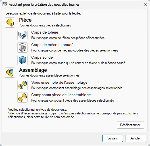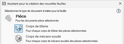 Die Auswahl eines Teilkörpers (Blech, Schweißkonstruktion, Vollmaterial) und/oder einer Baugruppenkomponente (Teilkomponente, Unterbaugruppe) erzeugt ein Blatt für jeden Teilkörper bzw. jede Komponente oder Unterbaugruppe.