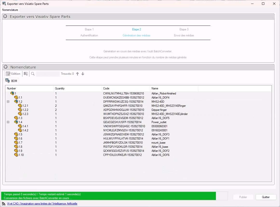 5. L'assistant passe à l'Étape 2 : Génération des médias. myCADtools lance l'outil BatchConverter pour produire les vues 3D de chaque composant. Simultanément, le système calcule et applique une codification unique à chacun des fichiers. Cette étape peut durer plusieurs minutes selon la complexité de l'assemblage.