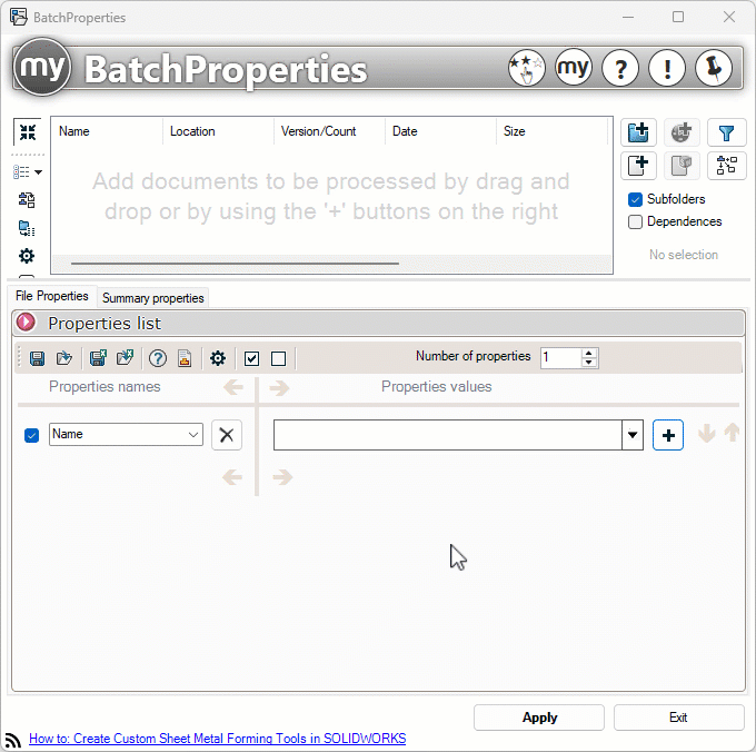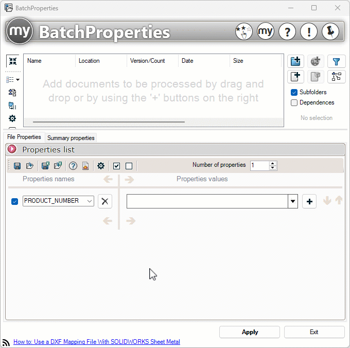 - Propriété personnalisée - En cochant cette option vous pouvez sélectionner le nom d'une propriété parmi une liste proposée. Cette liste affiche le contenu du fichier Properties.txt défini dans les options générales SOLIDWORKS. Si vous renseignez vos propriétés de fichiers via l'outil SmartProperties vous pouvez faire en sorte que cette liste soit le reflet des masques de saisies paramétrés dans SmartProperties (définition dans myCADPassport). Vous pouvez également renseigner une propriété manuellement si non présente dans la liste.