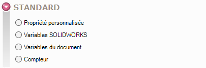 Cette zone propose de sélectionner des valeurs liées à l'environnement SOLIDWORKS :