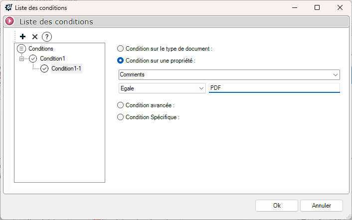 Plusieurs choix sont proposés. Pour notre exemple nous allons dans un premier temps ajouter une condition sur le type de document "Mise en plan". Dans un second temps nous allons rajouter une condition pour faire du "ET", sur la propriété "Comments" égale à "PDF"