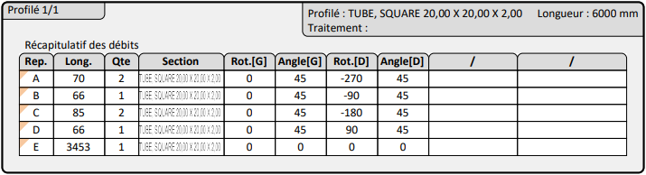 Partie contenant, sous forme de tableau, tous les détails des corps par profilé importés :