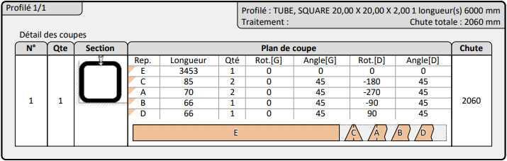 Aperçu des coupes sur la longueur de barre précedemment défini avec un calcul de la chute finale :