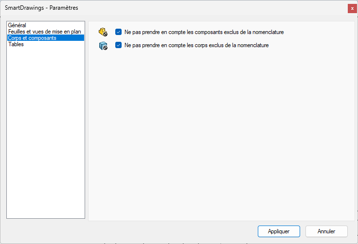 Les IncontournablesSmartDrawingsOptions Corps et composants Ces options, si cochés, permettent de ne pas prendre en compte les corps ou composants qui sont coché comme exclu de la nomenclature.