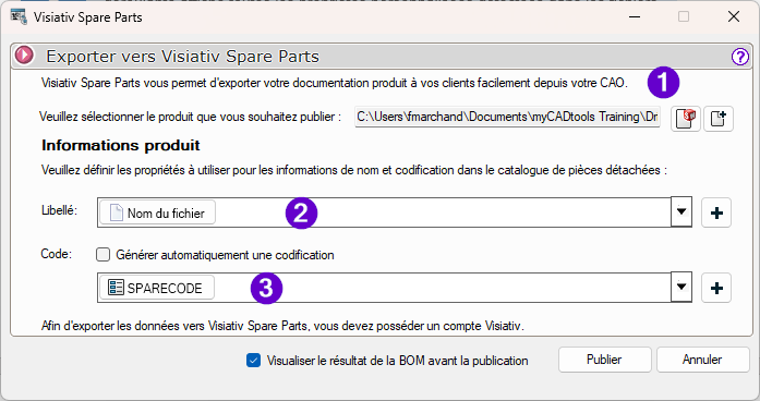 Vous pouvez également cocher l'option "Visualiser le résultat de la BOM avant la publication" afin d'avoir une étape de vérification des données avant publication vers le catalogue de pièces détachées Visiativ Spare Parts.
