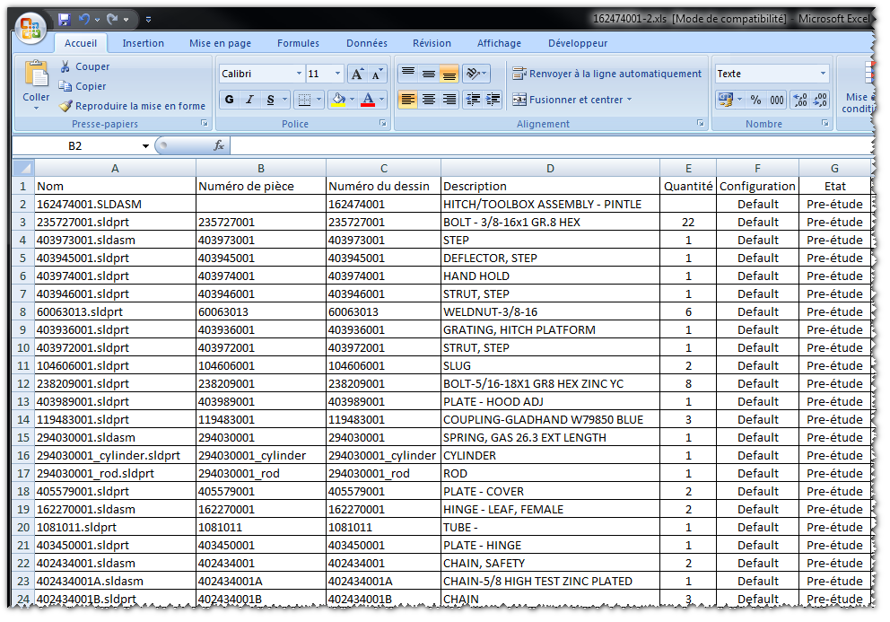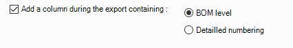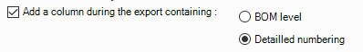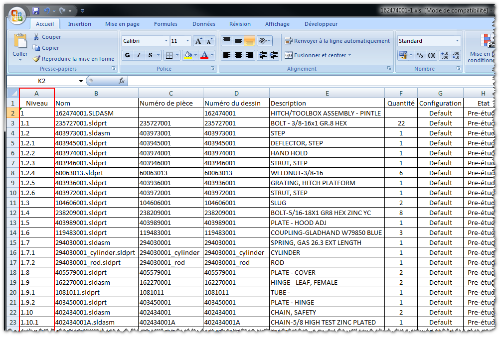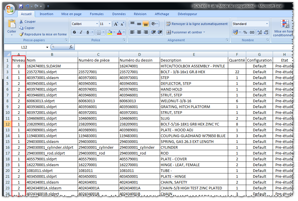 Beim Export der Stückliste kann eine Spalte hinzugefügt werden Ebene die entweder die Verschachtelungsebenen der Komponenten oder die detaillierte Nummerierung dieser Komponenten materialisieren. Hier sind die verschiedenen Ergebnisse des Excel-Exports in Abhängigkeit von den Einstellungen: