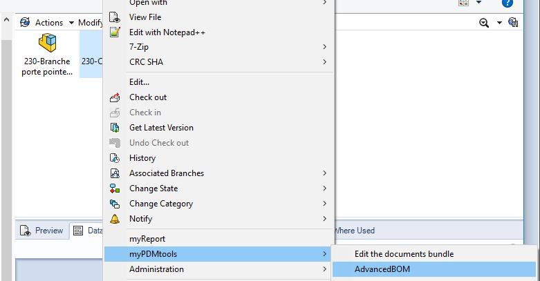Wenn Sie mit der rechten Maustaste aus der Truhe heraus klicken, bietet das Dropdown-Menü (wenn die Option aktiviert ist) das Tool zu starten AdvancedBom.