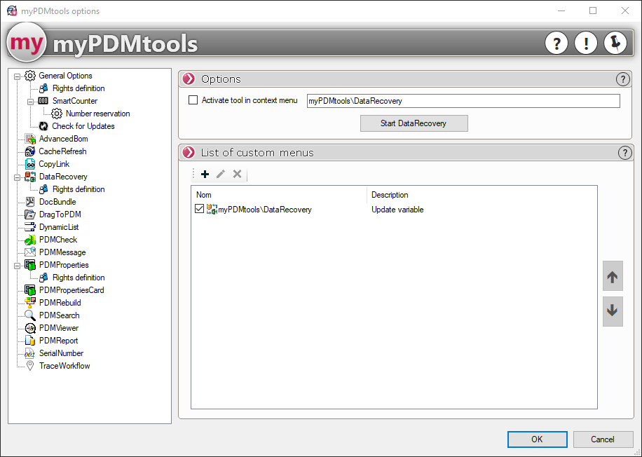 Das Werkzeug DataRecovery kann aus dem Administrationsfenster oder durch Rechtsklick in einem Dropdown-Menü gestartet werden, wenn diese Option aktiviert ist.