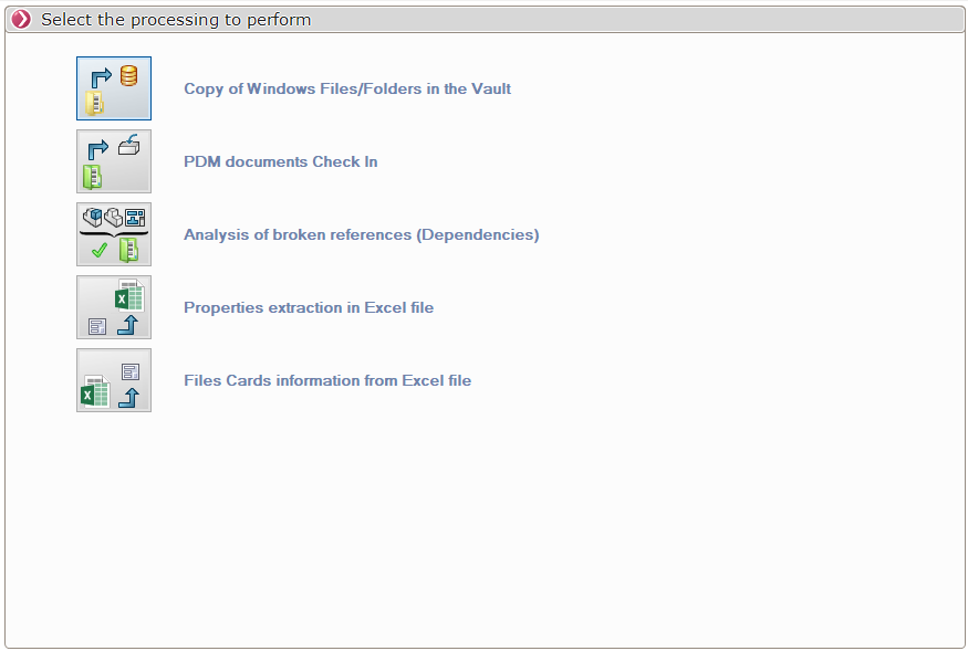 DataRecovery Liste der Aktionen Starten des Tools Liste der benutzerdefinierten Menüs Kopieren von Windows-Dateien/-Ordnern in die Dokumentenverwaltung Archivierung von Dokumenten Analyse von gebrochenen Verweisen (Dependencies) Ausfüllen der Datenkarten aus einer Excel-Datei Extrahieren von Eigenschaften in eine Excel-Datei