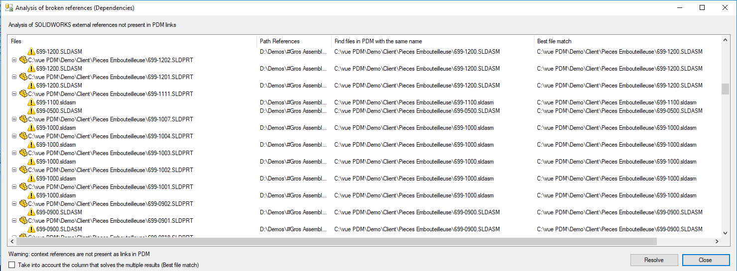 - Dateien gefunden in mit dem gleichen Namen: Diese letzte Spalte zeigt den Speicherort des SOLIDWORKS Dokuments in an (die Zeile ist leer, wenn die Datei nicht in der Dokumentenverwaltung gefunden wird).