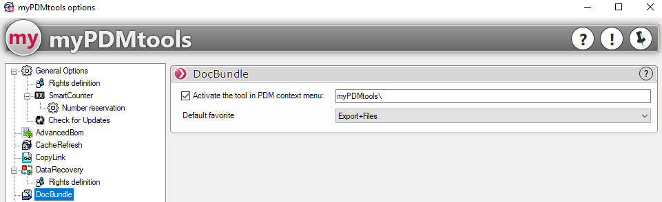Die administrativen Optionen von DocBundle sind über die Option myPDMtools zugänglich: