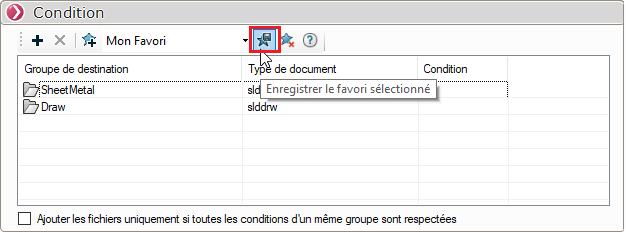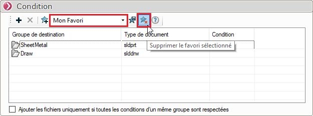 - Mit der Symbolleiste für Bedingungen können Sie eine Bedingung hinzufügen oder entfernen sowie einen Favoriten erstellen oder löschen.