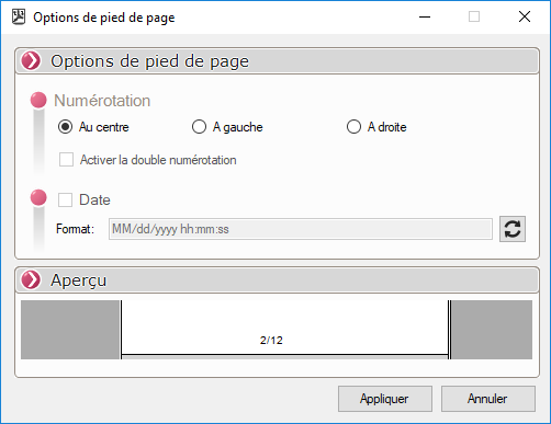 Die Option Fußzeile hinzufügen ermöglicht es, dem PDF eine Nummer auf jeder Seite mit verschiedenen Optionen hinzuzufügen: