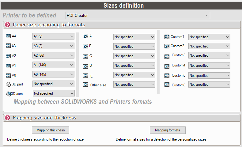 Legen Sie für jedes SOLIDWORKS Format eine Papierausgabegröße für den ausgewählten Drucker fest.