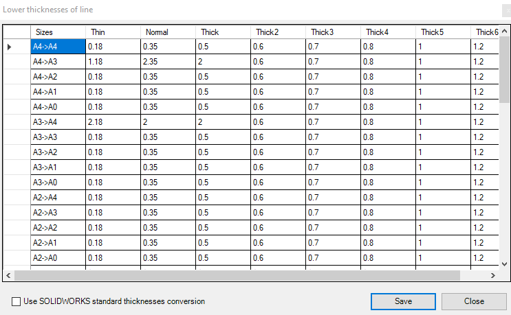Die Verkleinerung des Zeichnungsformats wird die Linienstärken beim Drucken verringern (z. B. wenn eine Zeichnung im Format A0 auf Ihrem Drucker im Format A3 ausgegeben wird). In dieser Tabelle können Sie die Linienstärken entsprechend der Verkleinerung des Formats festlegen.