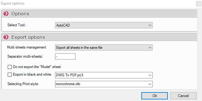 Für diese Art von Format DWG oder DXFDas erste Blatt heißt in der Regel Modell. Wenn Sie diese Option ankreuzen, können Sie sie ignorieren und nicht exportieren .