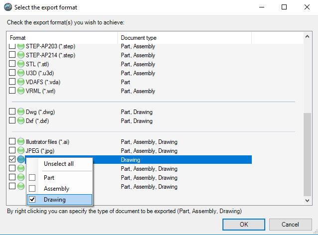 Mit einem Rechtsklick können Sie den Dokumententyp angeben, für den der Export durchgeführt werden soll (Teil, Baugruppe, Zeichnung).