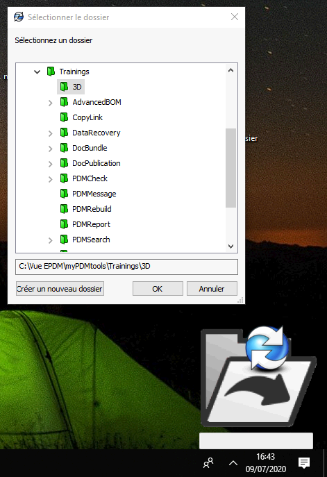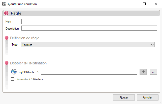Wenn Dateien durch diese Regel in PDM geleitet werden, dann wird dem Benutzer ein Fenster zur Auswahl eines Ordners angezeigt, aber die Ordnerauswahlbox wird standardmäßig auf den vom Administrator ausgewählten Ordner gesetzt: