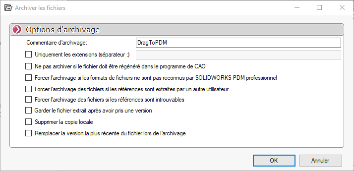 - 'Dateien archivieren': Mit dieser Option können Sie Dateien automatisch archivieren, nachdem sie der Dokumentenverwaltung hinzugefügt wurden, und zwar durch DragToPDM.