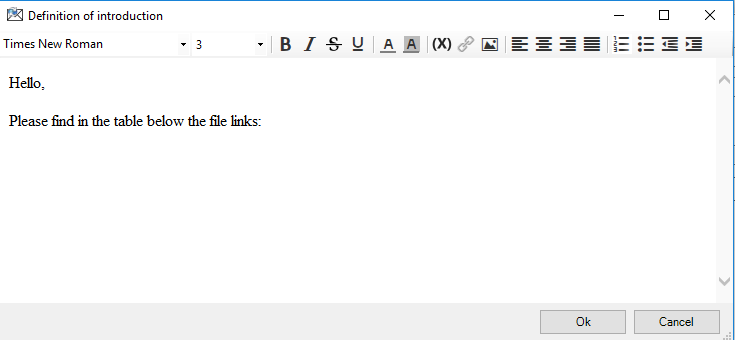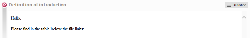 PDMMessageDefinition von NachrichtenvorlagenEine Vorlage hinzufügen oder ändern Einleitung und Schlussfolgerung Eine Einleitung und ein Schluss können verfasst werden, sind aber optional. Nutzen Sie alle Funktionen des Editors, um den Text zu schreiben (Schriftarten, Typ, Farbe, Rechtschreibung, Hyperlinks, Bilder usw.).