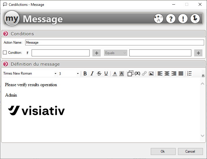 CardActionsHinzufügen von Aktionen Nachricht Mit der Aktion Nachricht können Sie dem Benutzer mithilfe eines Texteditors eine Nachricht anzeigen. So ist es möglich, die Schriftart und -größe zu ändern, den Text anzureichern, Bilder hinzuzufügen...:
