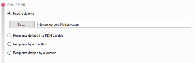 Es ist zum Beispiel möglich, den Empfänger aus einer PDM-Variablen in der verarbeiteten Datei abzurufen, abhängig von den Bedingungen oder dem Speicherort der verarbeiteten Dateien, oder einfach einen festen Empfänger zu verwenden, um beispielsweise einen Administrator zu benachrichtigen: