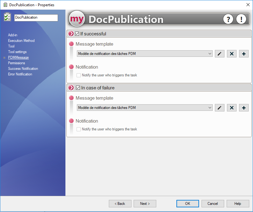 Im Abschnitt PDMMessageSie müssen nur noch das Tool aktivieren und die Vorlage auswählen, die im Erfolgsfall oder bei Misserfolg verwendet werden soll: