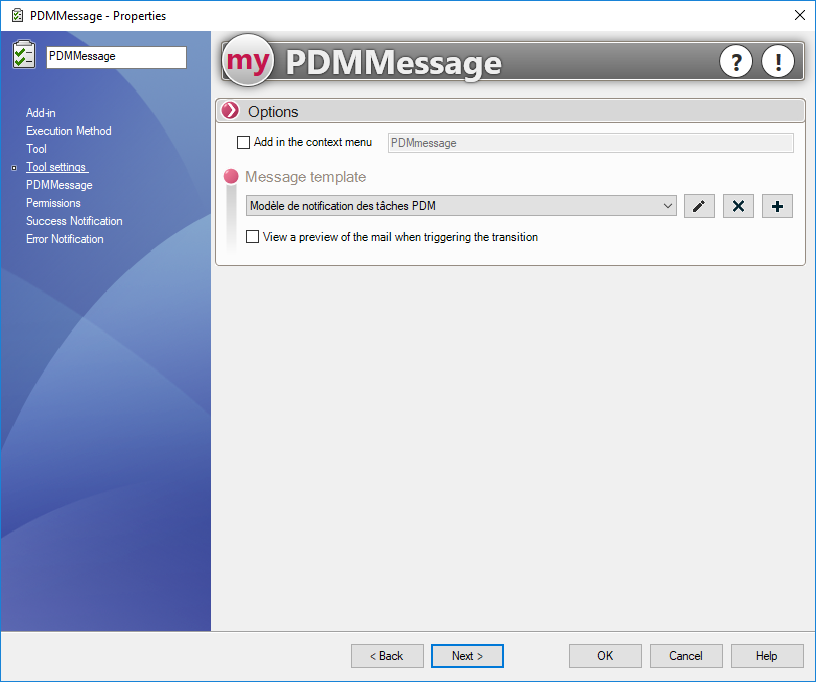Die Einstellung von PDMMessage ist ganz einfach. Wählen Sie einfach PDMMessage in myPDMtoolsund erstellen Sie dann eine neue Nachrichtenvorlage.