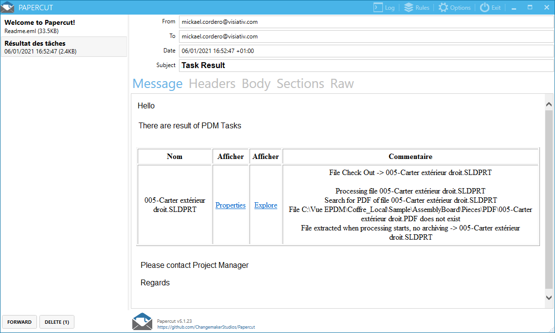 Mit dem Werkzeug PDMMessage der Toolsuite myPDMtoolsEs ist möglich, automatisch benachrichtigt zu werden, wenn eine Aufgabe in einem Werkzeug myPDMtools scheitert oder sogar, wenn sie erfolgreich ist.