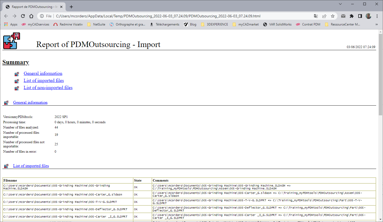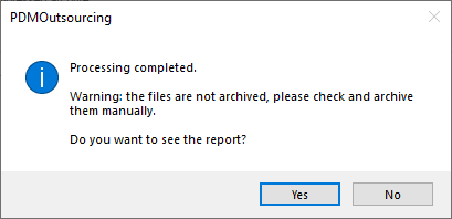 PDMOutsourcingImport eines ausgelagerten Projekts Bericht über den Import eines Projekts Beim Import wird dem Benutzer eine Meldung angeboten, die Dokumente vor der Archivierung zu überprüfen. Der Bericht kann auch angezeigt werden: Wenn Sie auf Ja klicken, wird eine HTML-Seite mit den Informationen über den Import angezeigt: