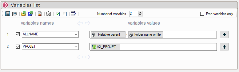 Hier werden die Namen der Variablen zusammen mit dem Wert, der ihnen zugewiesen werden soll, definiert. Der Name wird aus einer Dropdown-Liste ausgewählt und der Wert wird durch Klicken auf das Symbol + (siehe Kapitel Die Art der Felder).
