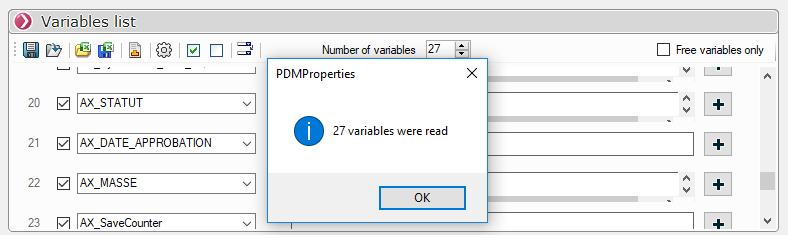 Sobald Sie eine Datei ausgewählt haben, PDMProperties gibt die Anzahl der abgerufenen Variablen an: