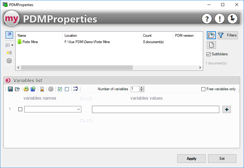 'PDMProperties' (Eigenschaften) ermöglicht das Ausfüllen von Datenkartenvariablen aus Dateien oder Ordnern, die in einer Dokumentenverwaltung enthalten sind . Diese Informationen können aus dem Inhalt der Datenkartenvariablen aus Dateien oder Ordnern in der Dokumentenverwaltung abgerufen werden .