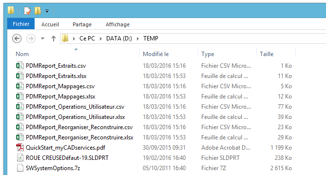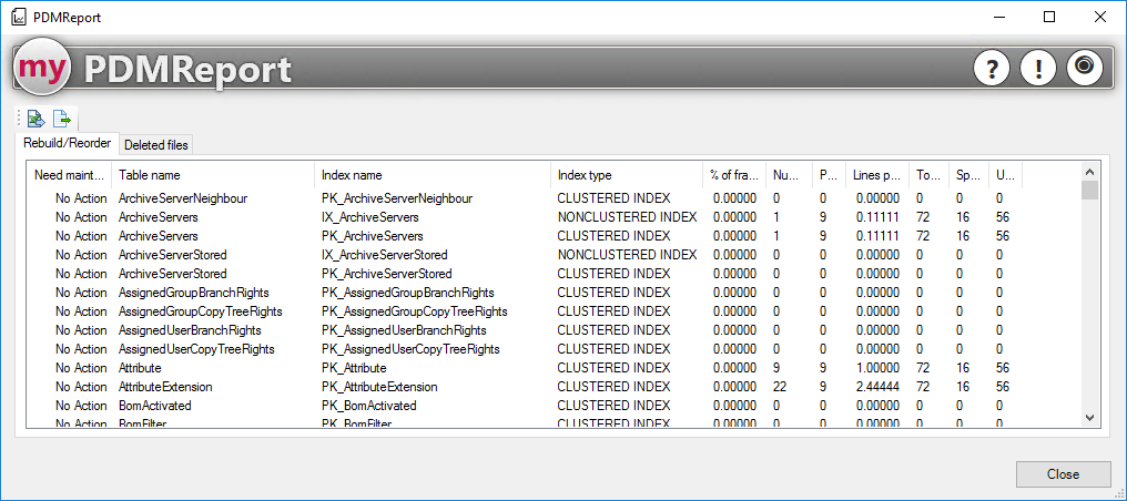 Man findet die standardmäßig extrahierten Parameter sowie die Spalten, die den Variablen entsprechen, die eventuell ausgewählt wurden (siehe Optionen PDMReport).