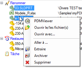 Mit einem Rechtsklick auf eine oder mehrere ausgewählte Dateien können Sie bestimmte Aktionen ausführen: das PDMViewer-Tool starten, die Datei(en) in SOLIDWORKS öffnen, zum Verzeichnis der ausgewählten Datei(en) wechseln, die ausgewählte(n) Datei(en) extrahieren, einchecken oder löschen.