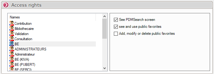 Dieses Fenster bietet dem Administrator die Möglichkeit, Rechte entsprechend der in definierten Gruppen zu vergeben. Beispielsweise können Benutzer der Gruppe Designer können nur die Suchfavoriten sehen und nutzen, die angegeben wurden als öffentliche.