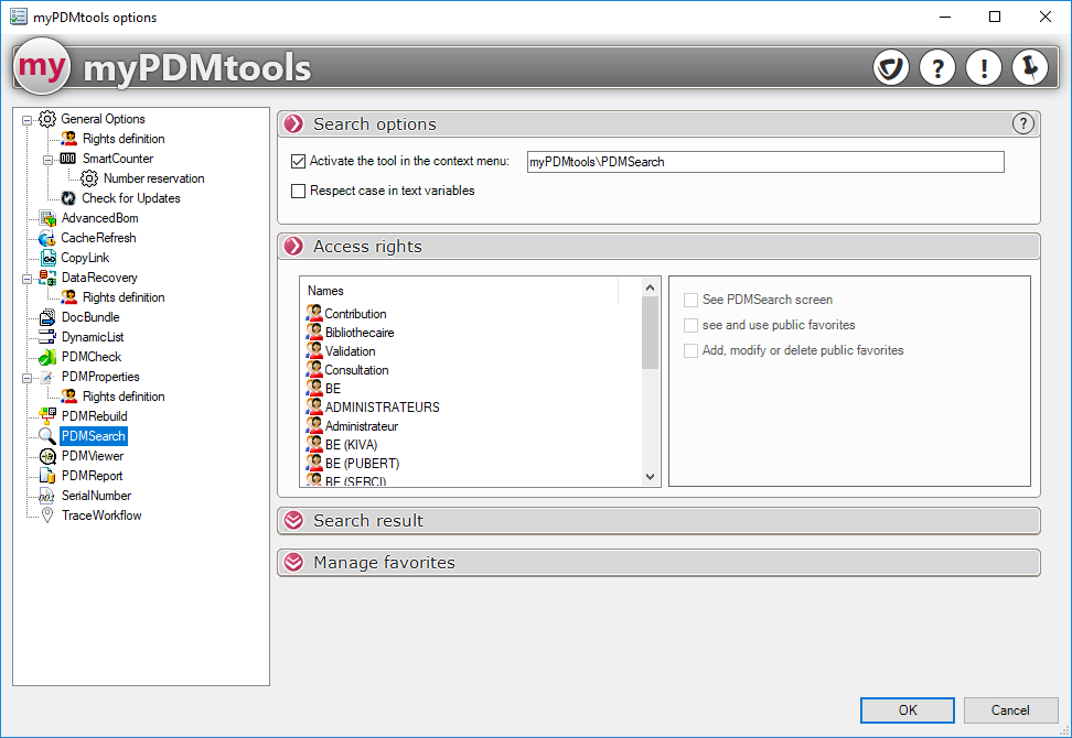 Wenn diese Option nicht angekreuzt ist, können die Benutzer, die zu dieser Gruppe gehören, keine Suche starten (das Werkzeug PDMSearch wird nicht gestartet). Die folgenden Optionen haben keinen Nutzen.