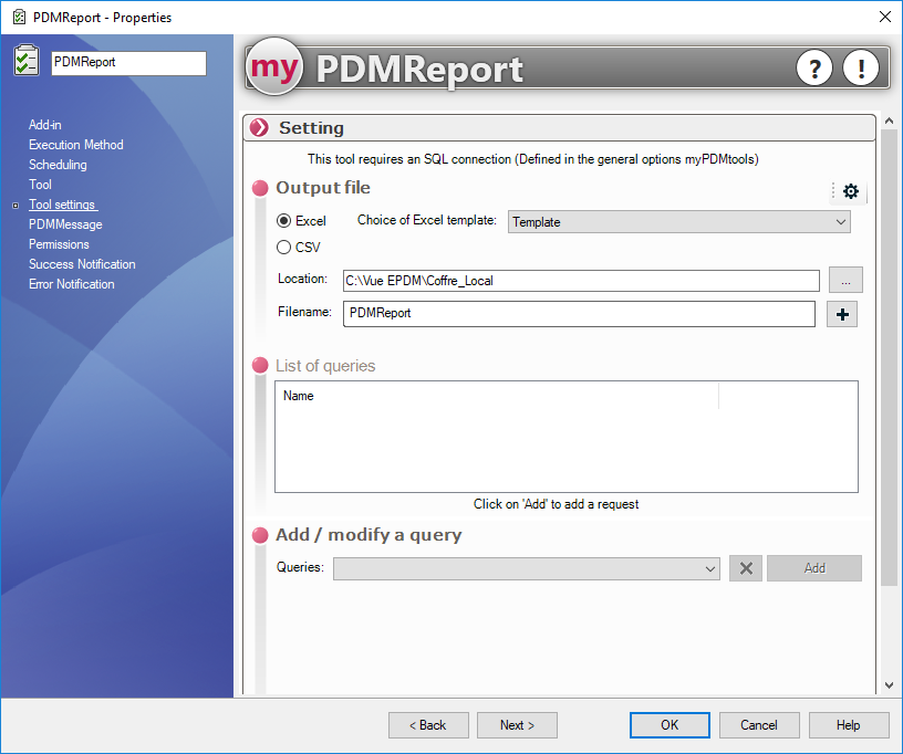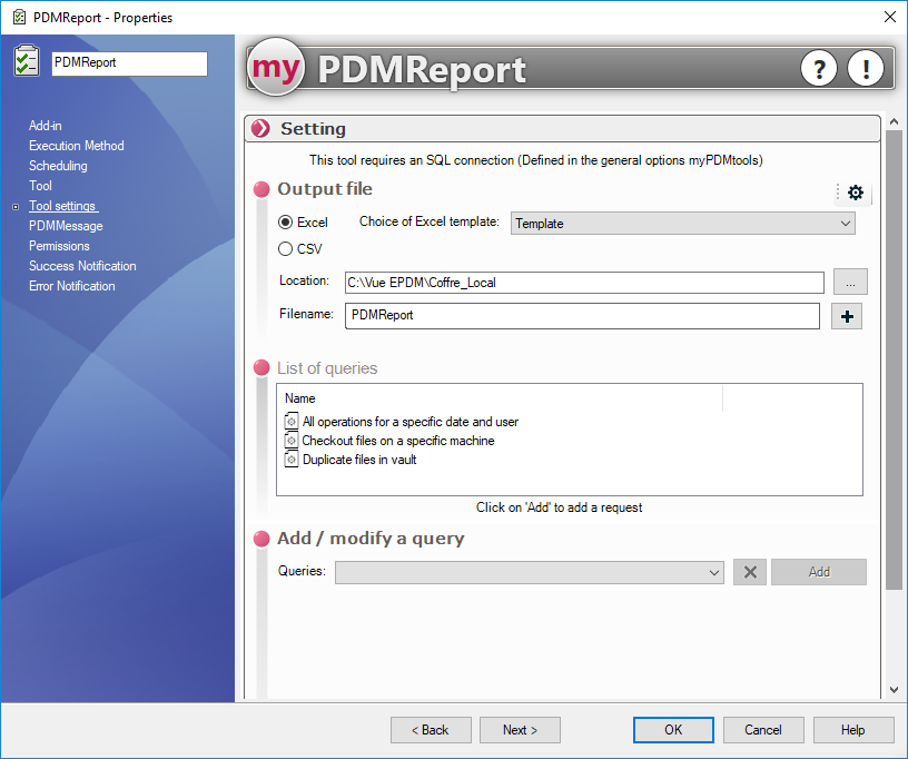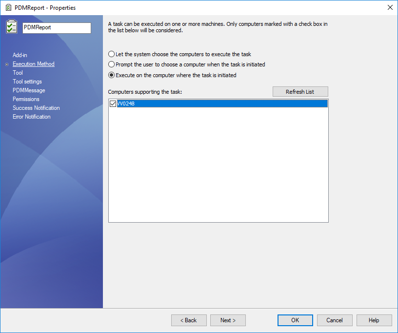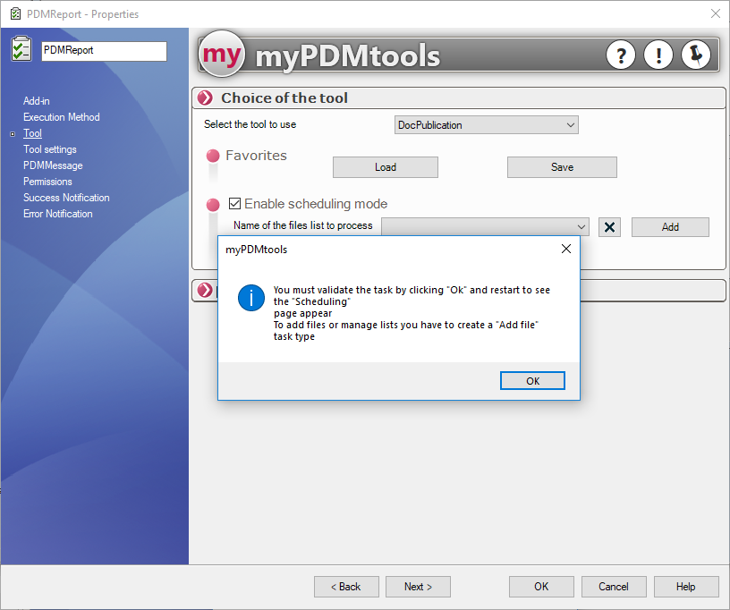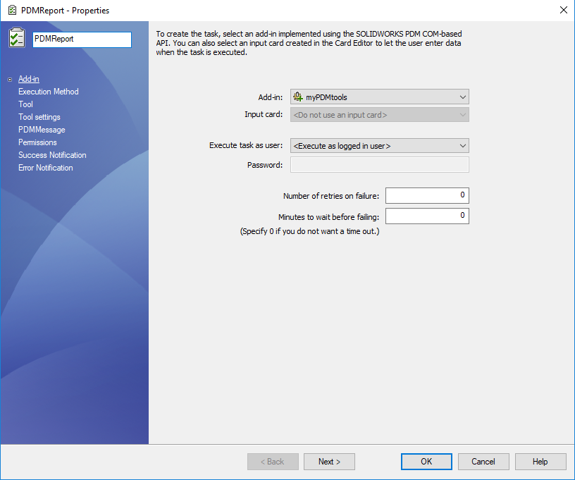 Wir nennen diese Aufgabe PDMReport und wählen das Add-In myPDMtools: