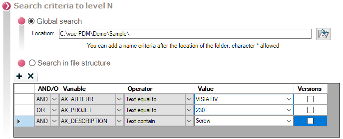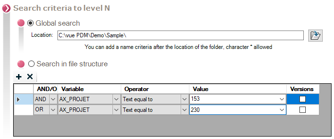 Variablen, nach denen in allen Versionen gesucht werden soll, werden von den anderen Kriterien durch ein Häkchen in der Spalte Versionen.