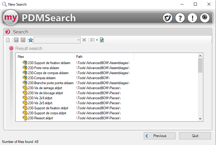 Das Suchergebnis wird im unteren Bereich des Fensters in Form einer Tabelle mit den Spalten angezeigt, die Sie unter Optionen von PDMSearchHier wurden 2 Dateien gefunden, die den Suchkriterien entsprechen: