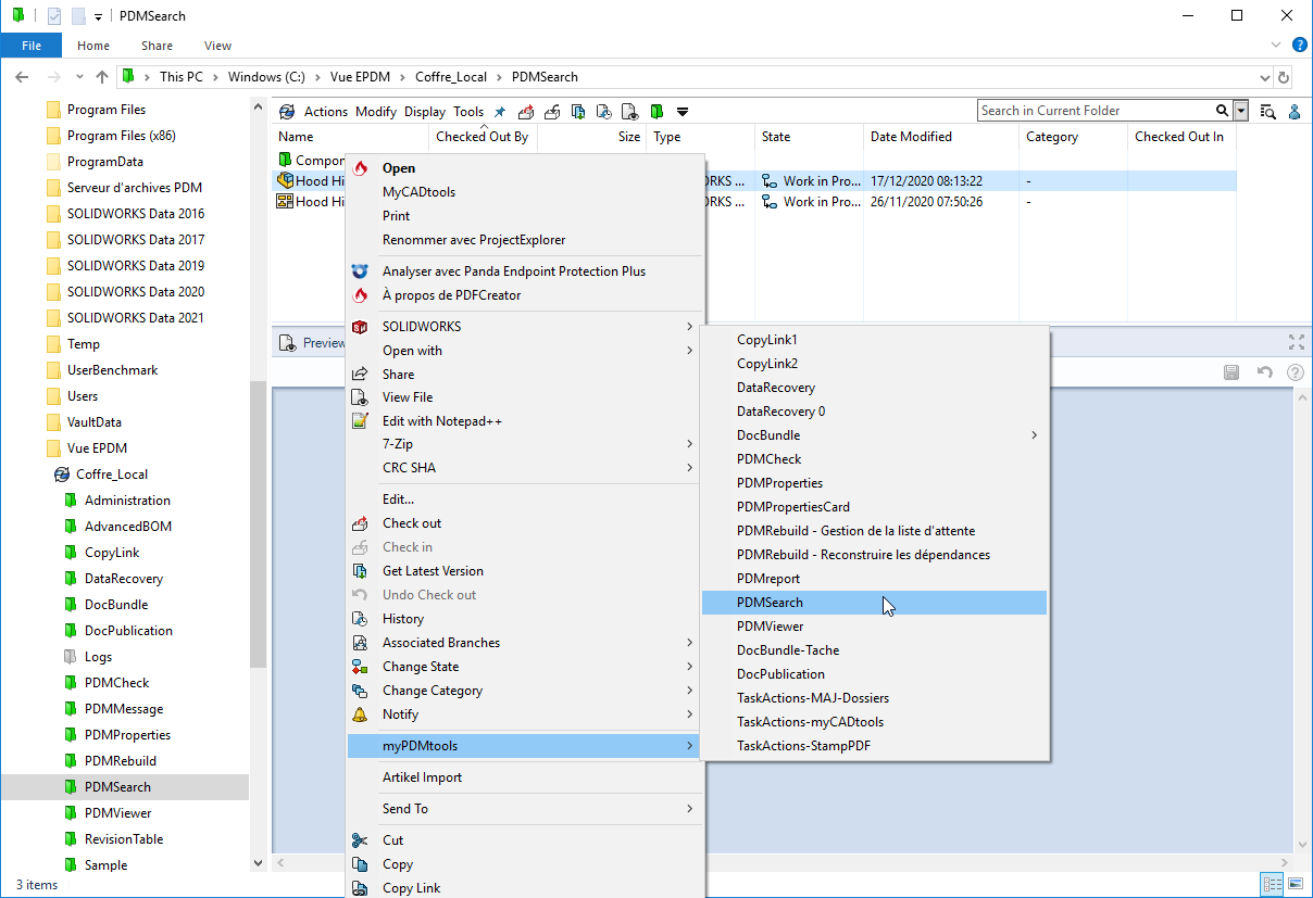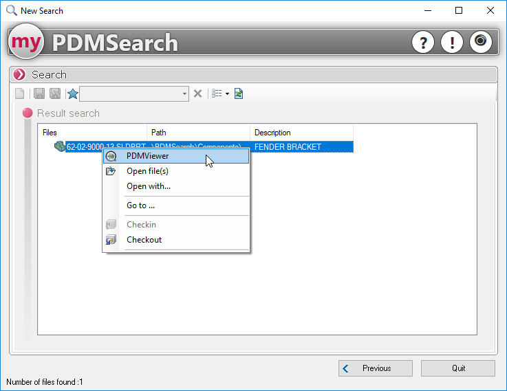 Durch einen Rechtsklick auf das Ergebnis werden mehrere Aktionen verfügbar, wie z. B. das Öffnen der Datei in der Software PDMViewer :