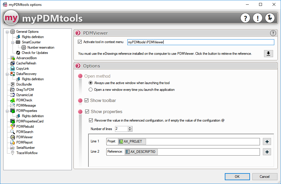 PDMViewer PDMViewer-Optionen Die Einstellungen bieten: Aktivieren Sie das Werkzeug im Kontextmenü Wahl des Öffnungsmodus von PDMViewer Symbolleiste anzeigen Attribute anzeigen