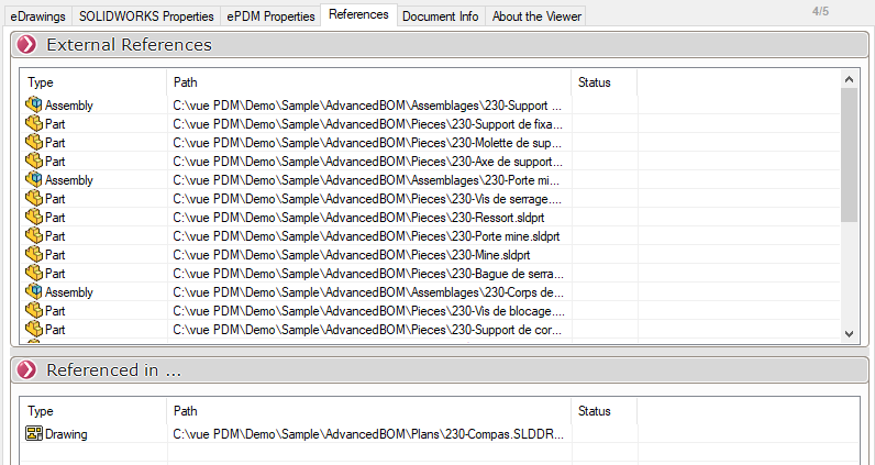 PDMViewerVerwendung von PDMViewer Registerkarte Referenzen Der Tab Referenzen zeigt die Verweise und Verwendungsnachweise der Datei an: Externe Referenzen enthält z. B. die Referenzen einer Baugruppe. Referenziert in enthält z. B. die Verwendungsnachweise für einen Raum.