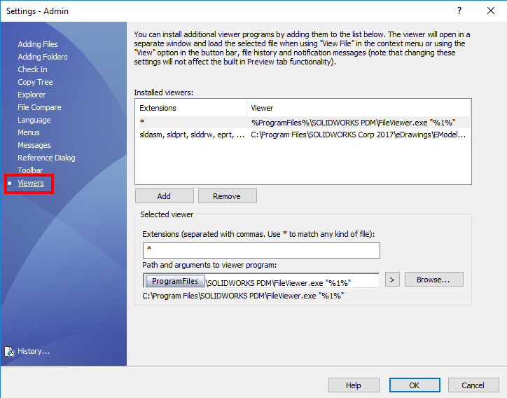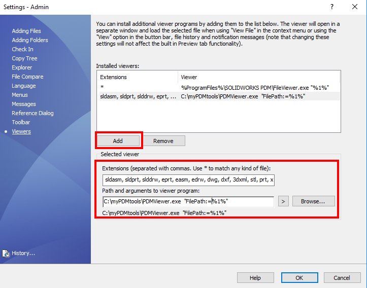 Sie müssen das Feld mit den Erweiterungen ausfüllen, die mit diesem Viewer verwendet werden sollen, im folgenden Beispiel die Erweiterungen sldprt, sldasm und slddrw wurden aus dem Viewer entfernt eDrawings und wurden dem Viewer hinzugefügt PDMViewer.