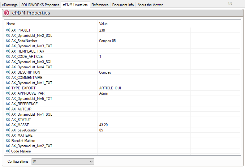 PDMViewerVerwendung von PDMViewer Registerkarte PDM-Eigenschaften Auf dieser Registerkarte können Sie die Variablen der Datei anzeigen. Es ist möglich, zwischen den verschiedenen Konfigurationen der Datei zu wechseln.